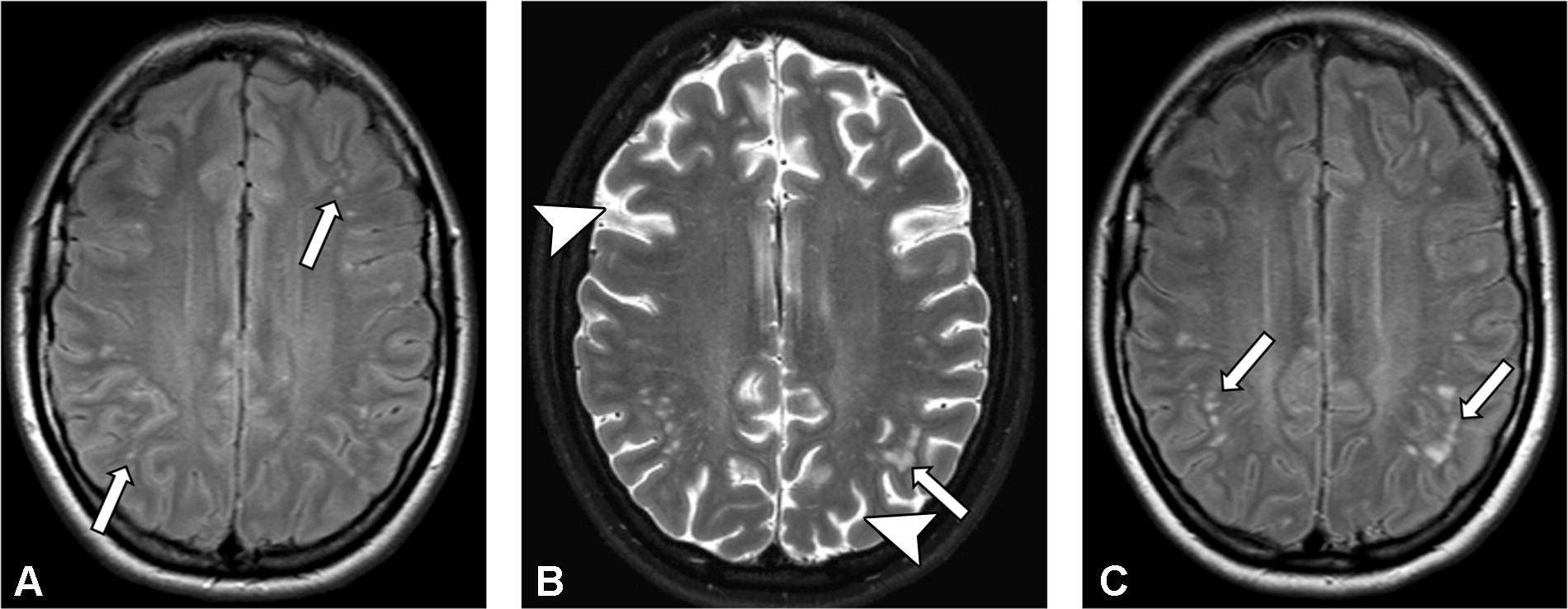 Resonancia magnética cerebral. A) Secuencia axial FLAIR, se observan hiperintensidades subcorticales difusas en ambos hemisferios cerebrales. B y C) Secuencia axial T2, realizada 2 meses posterior a la enfermedad de inicio, se observa ensanchamiento del espacio subdural por pérdida del volumen cerebral, y aumento de tamaño de las hiperintensidades subcorticales, visualizadas tanto en T2 como en FLAIR a la derecha.