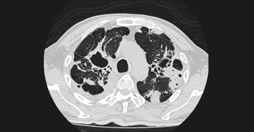 La tomografía de tórax contrastada demostró distorsión difusa de la arquitectura pulmonar secundaria a múltiples áreas de consolidación alveolar bilateral, asociadas a patrón de árbol en gemación y múltiples cavitaciones pulmonares. Destaca la presencia de una cavidad en el lóbulo superior izquierdo que contiene una lesión nodular intracavitaria compatible con bola fúngica, hallazgo sugestivo de aspergiloma desarrollado sobre cavidad pulmonar previa.